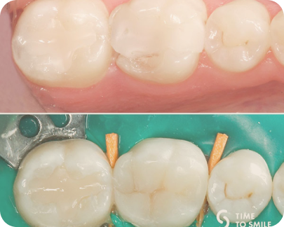 При осмотре обнаружен дефект прилегания старой пломбы, скол части реставрации и стенки зуба, вторичный кариес под пломбой.